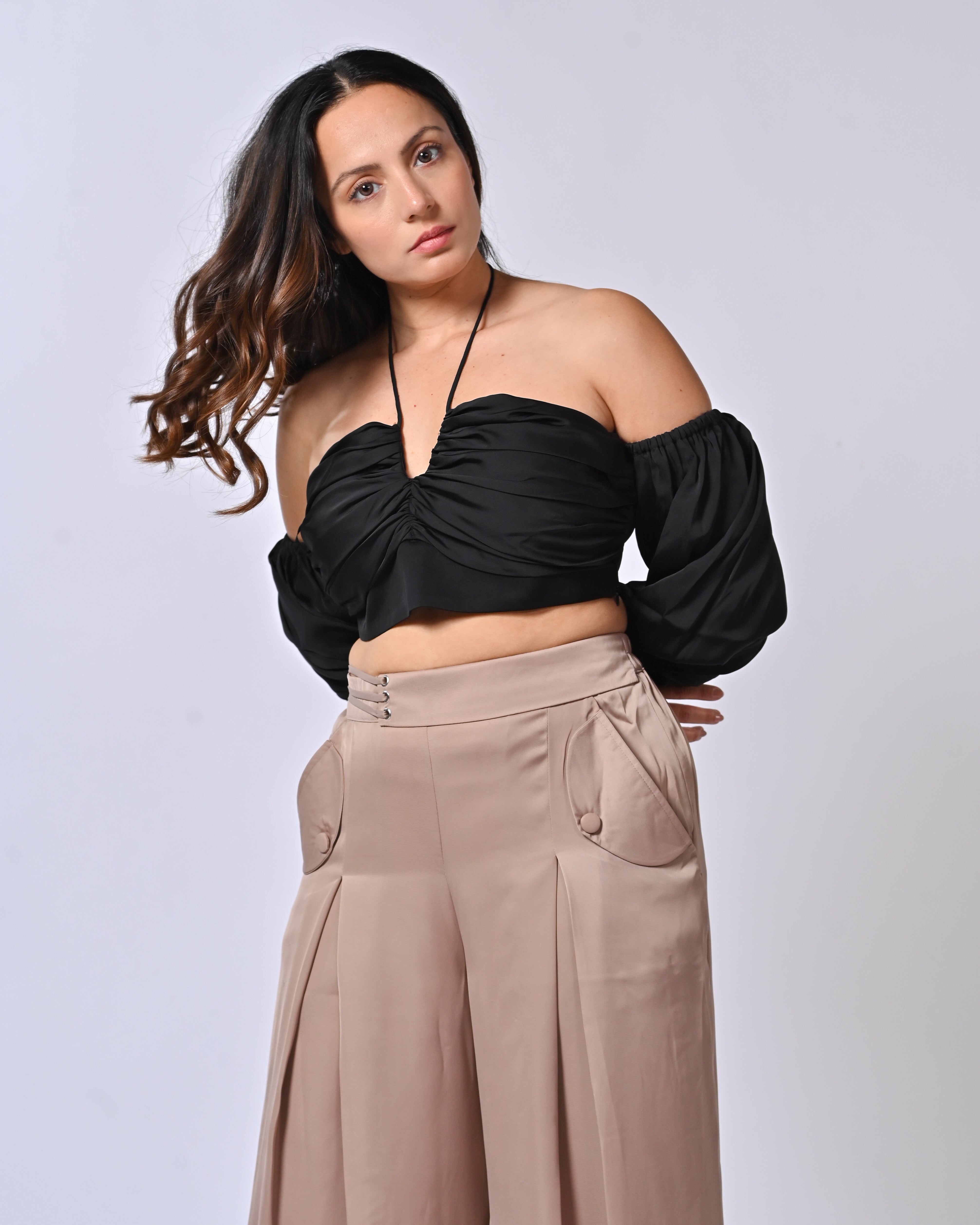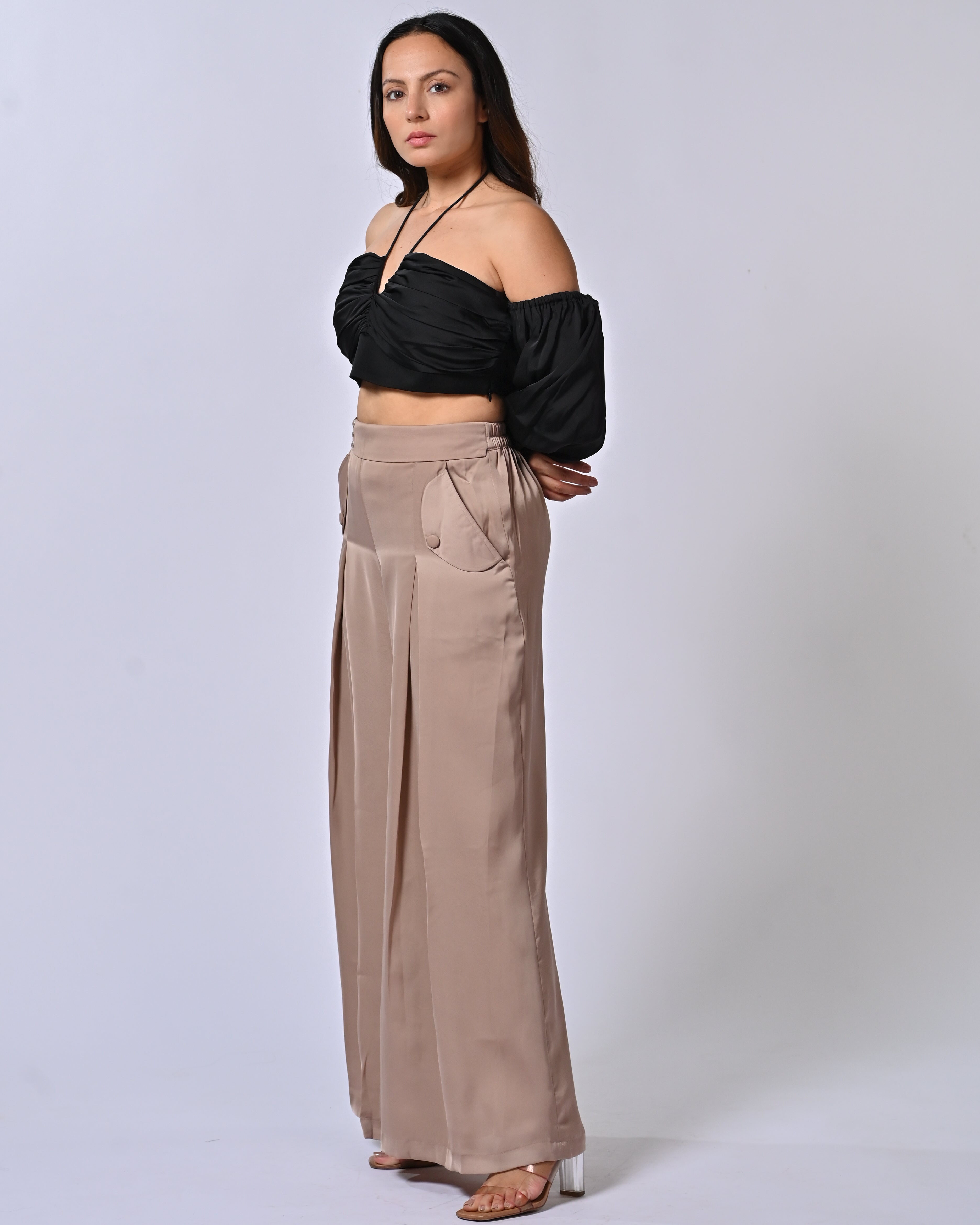 Unleash timeless elegance with our Black & Tan Brown Tube Top With Box Pleat Pants, crafted from luxurious, lightweight polyester for effortless comfort and style. This chic two-piece set features a sleek black tube top with off-shoulder ruffle sleeves and a daring keyhole cut-out, paired with flowing tan brown pants boasting sharp box pleats and functional pockets for a modern twist.