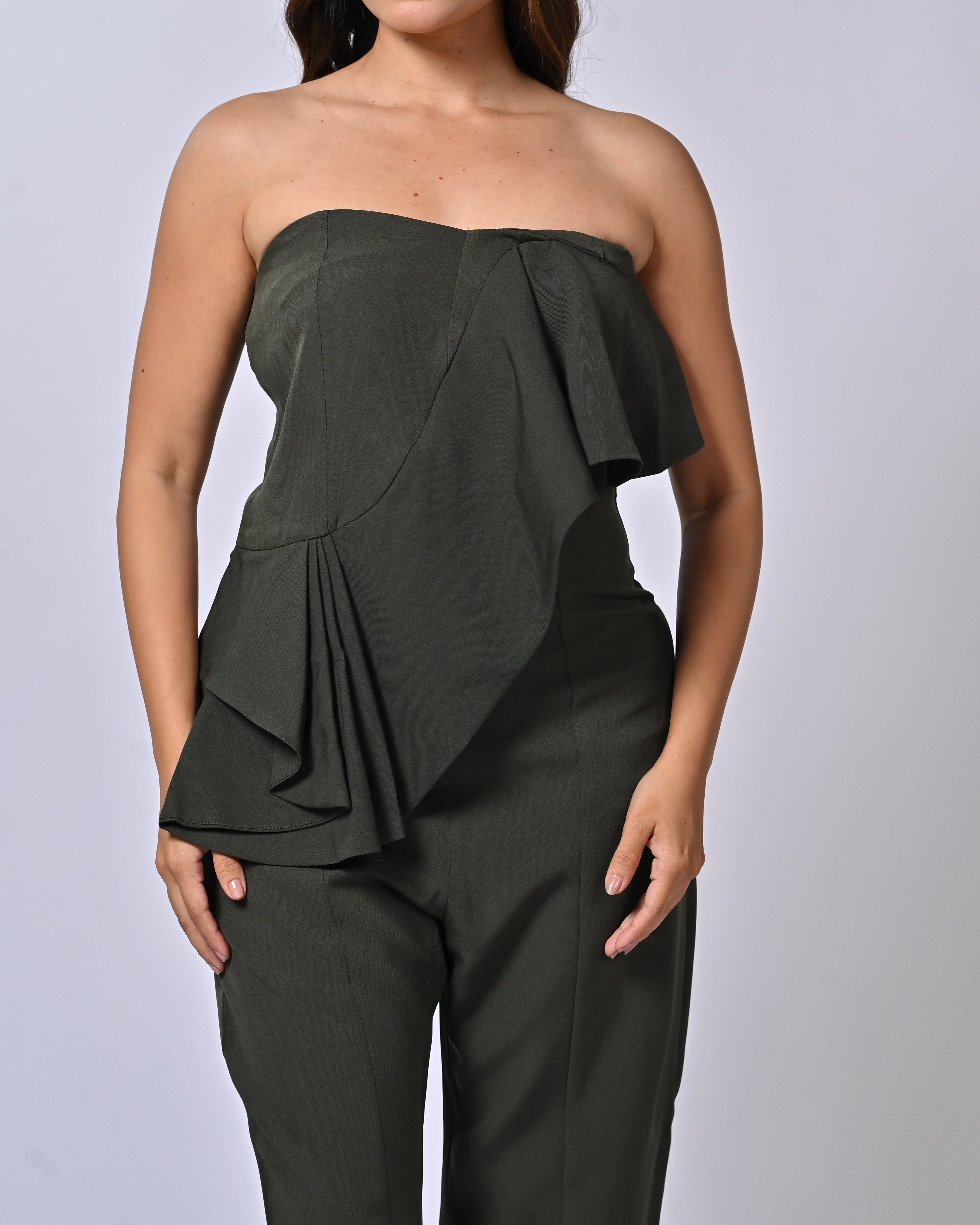 Command attention with our Chic Army Green Strapless Jumpsuit Set, crafted from stretchable poly-cotton for a flattering, comfortable fit. This striking design features a strapless, ruffled bustier paired with sleek, tailored pants, blending modern sophistication with bold elegance. Its stretch fabric ensures ease of movement, while the fitted silhouette highlights your curves with timeless grace.