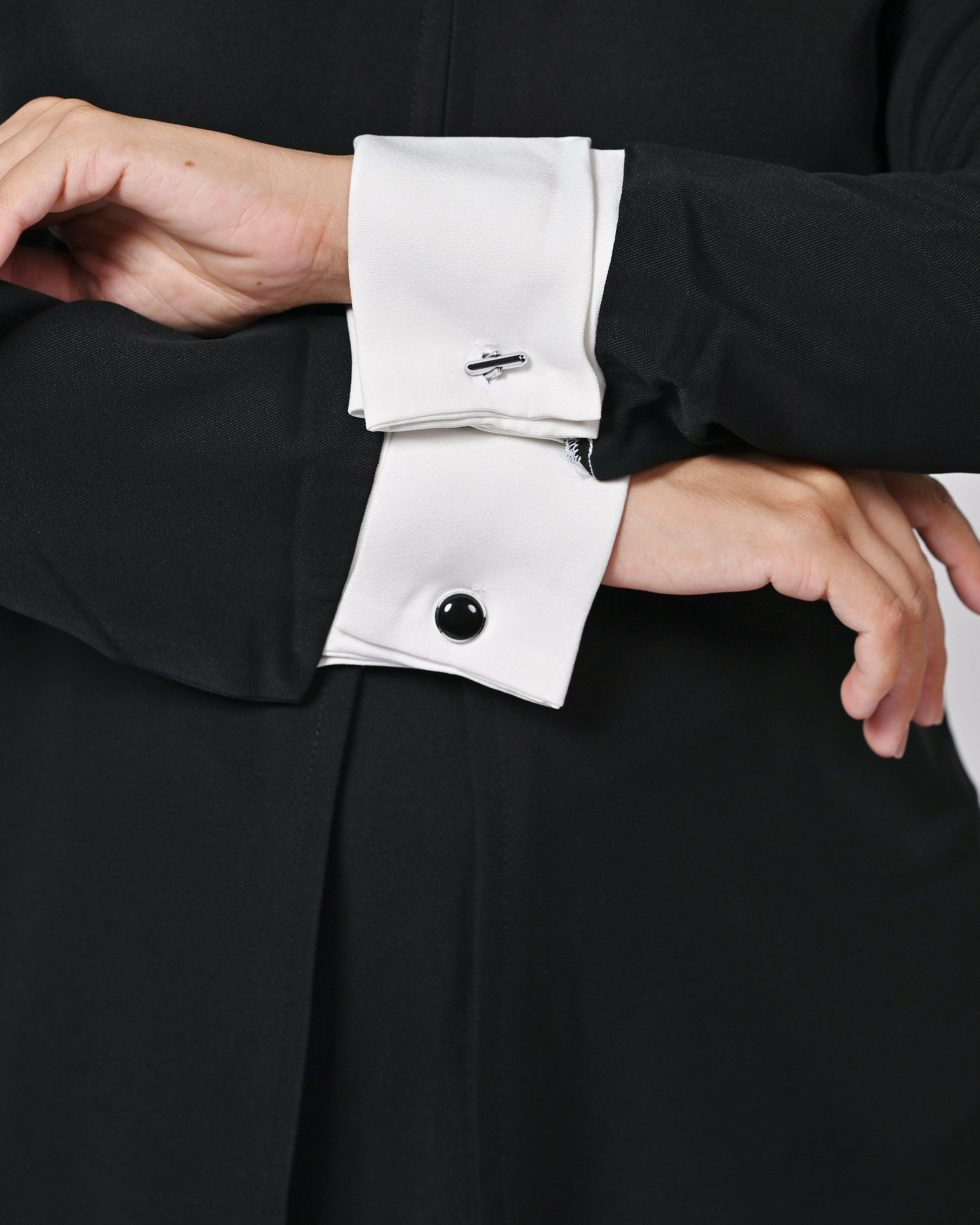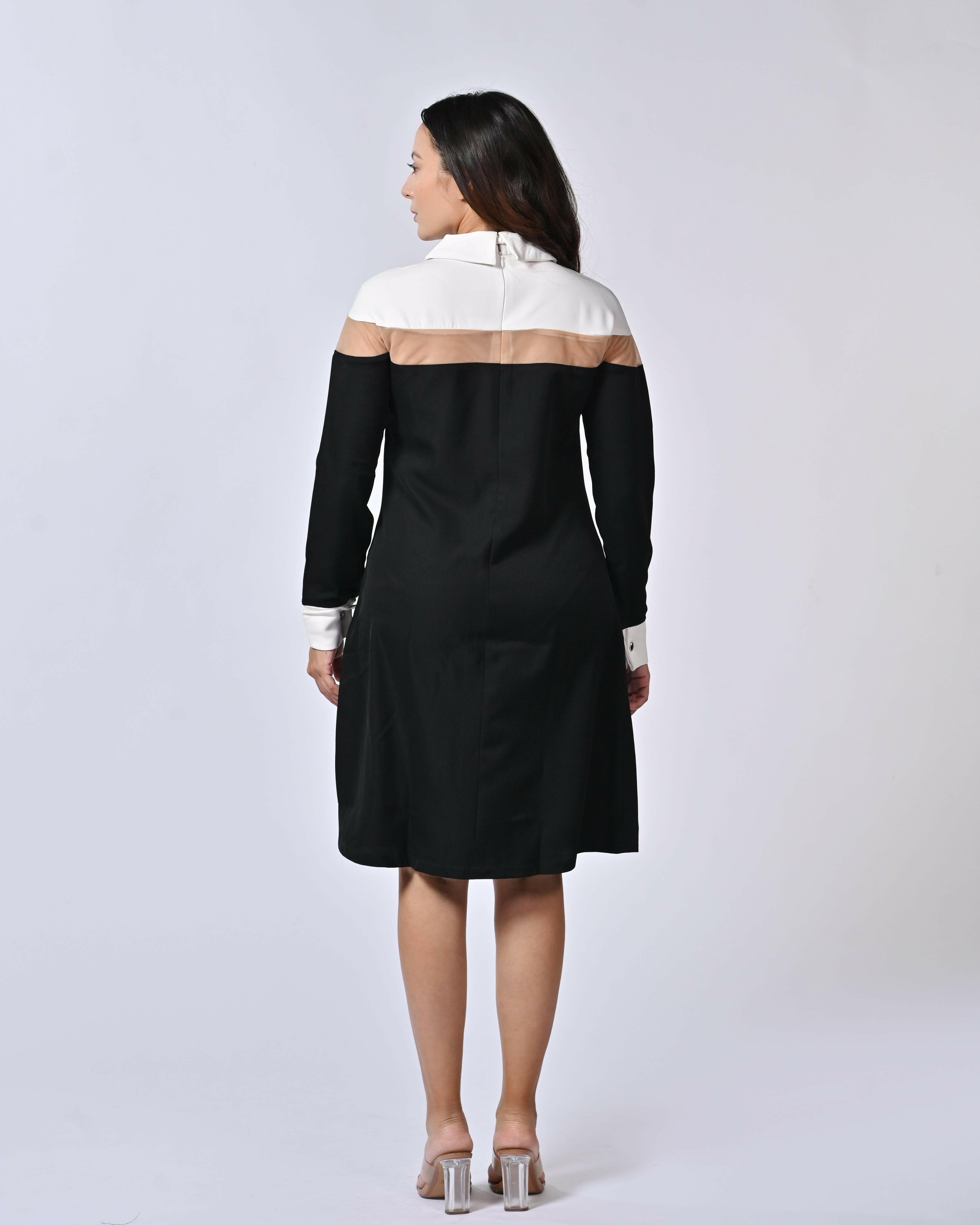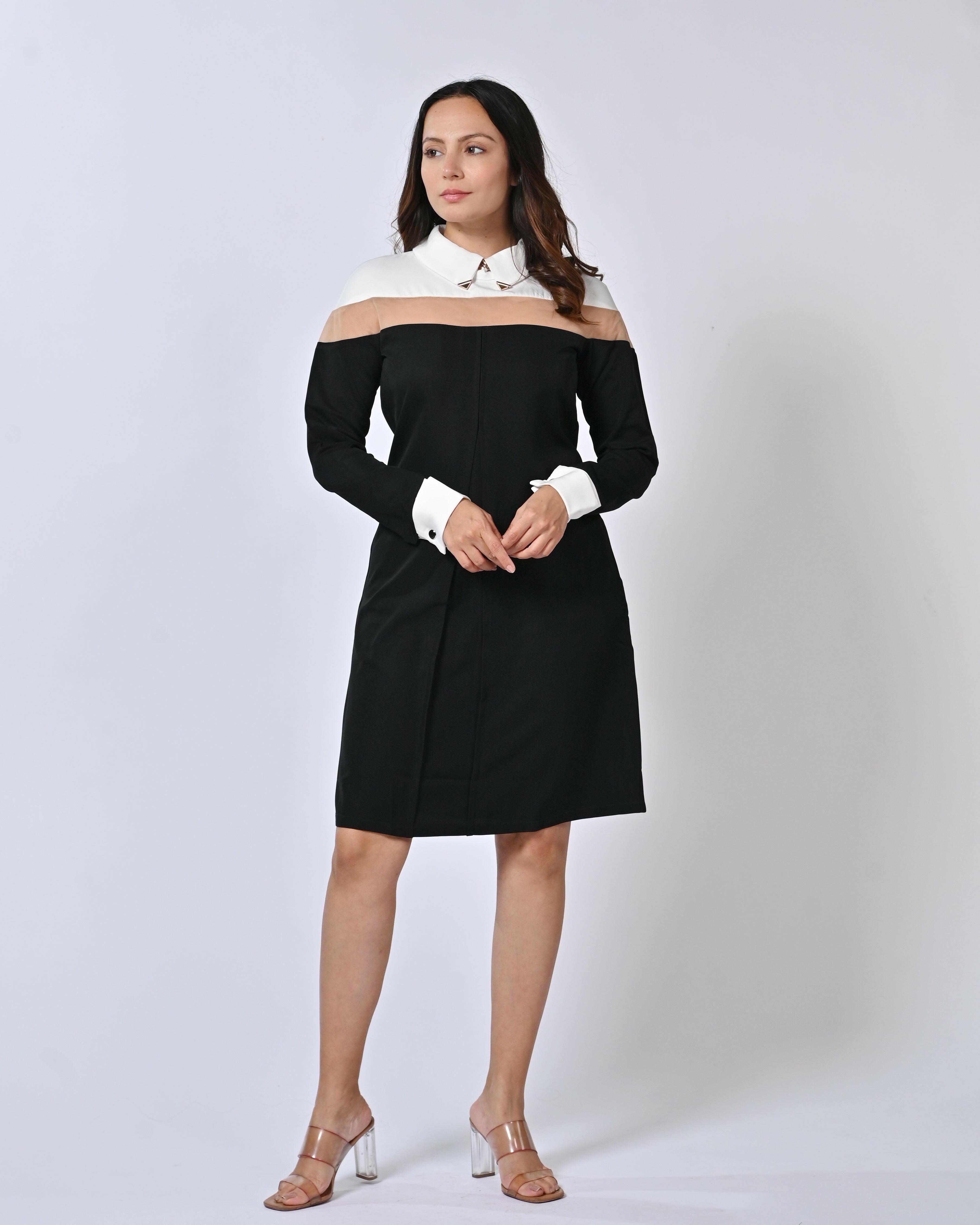 Elevate your wardrobe with our Chic Black & White Formal Dress, meticulously crafted from premium polycotton for a crisp, comfortable fit. This striking design features a sleek black body with elegant white accents at the collar, cuffs, and off-shoulder yoke, blending timeless sophistication with modern flair. The knee-length, A-line silhouette flatters every figure, while long sleeves and subtle pleats add refined polish.