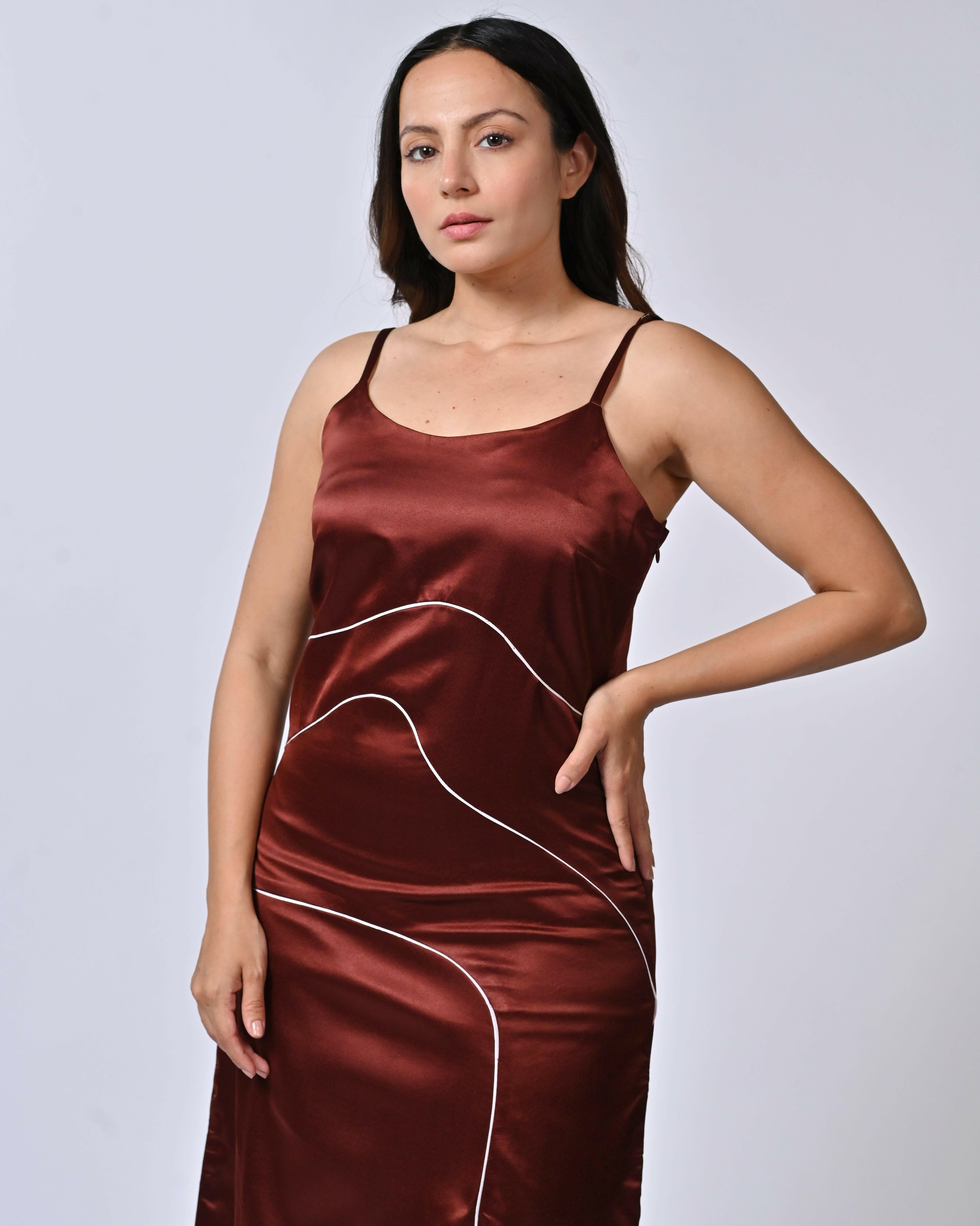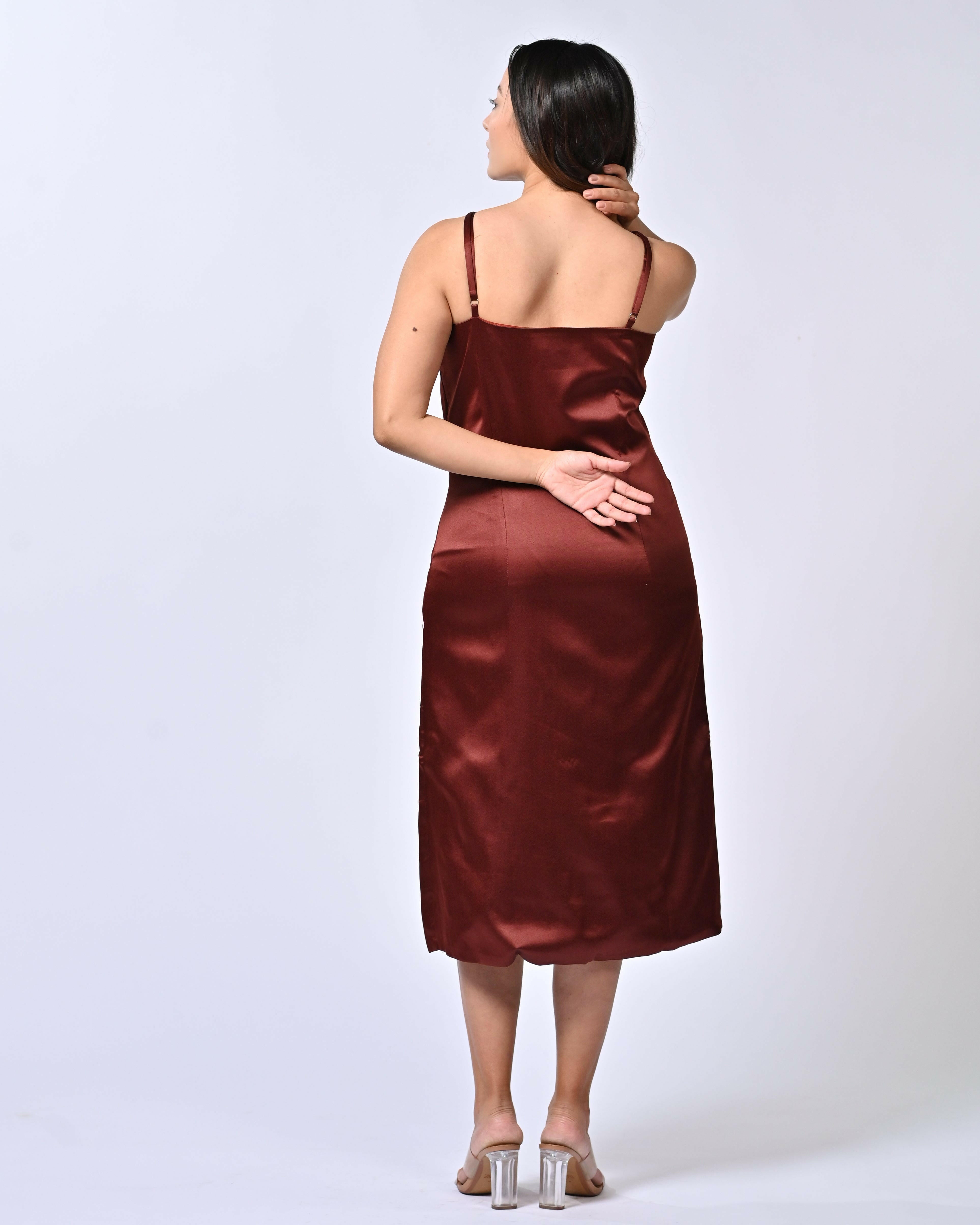 Radiate timeless elegance with our Chocolate Brown Side-Slit Mini Dress, crafted from luxurious cotton and satin for a smooth, lustrous finish. This striking design features a sleek, form-fitting silhouette accentuated by bold side slits that add a hint of modern allure. Its knee-length cut and subtle shimmer ensure a polished, confident look with every movement.