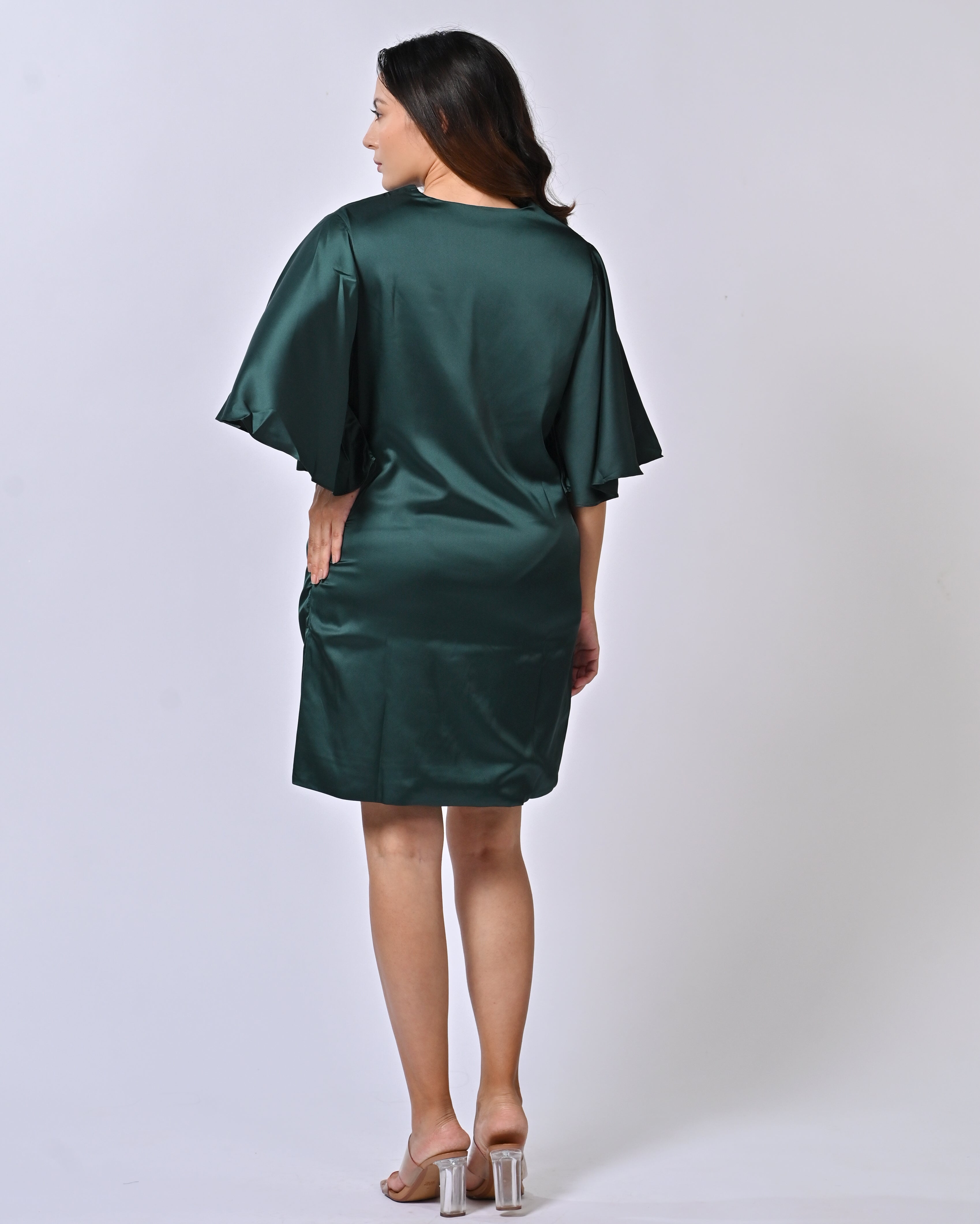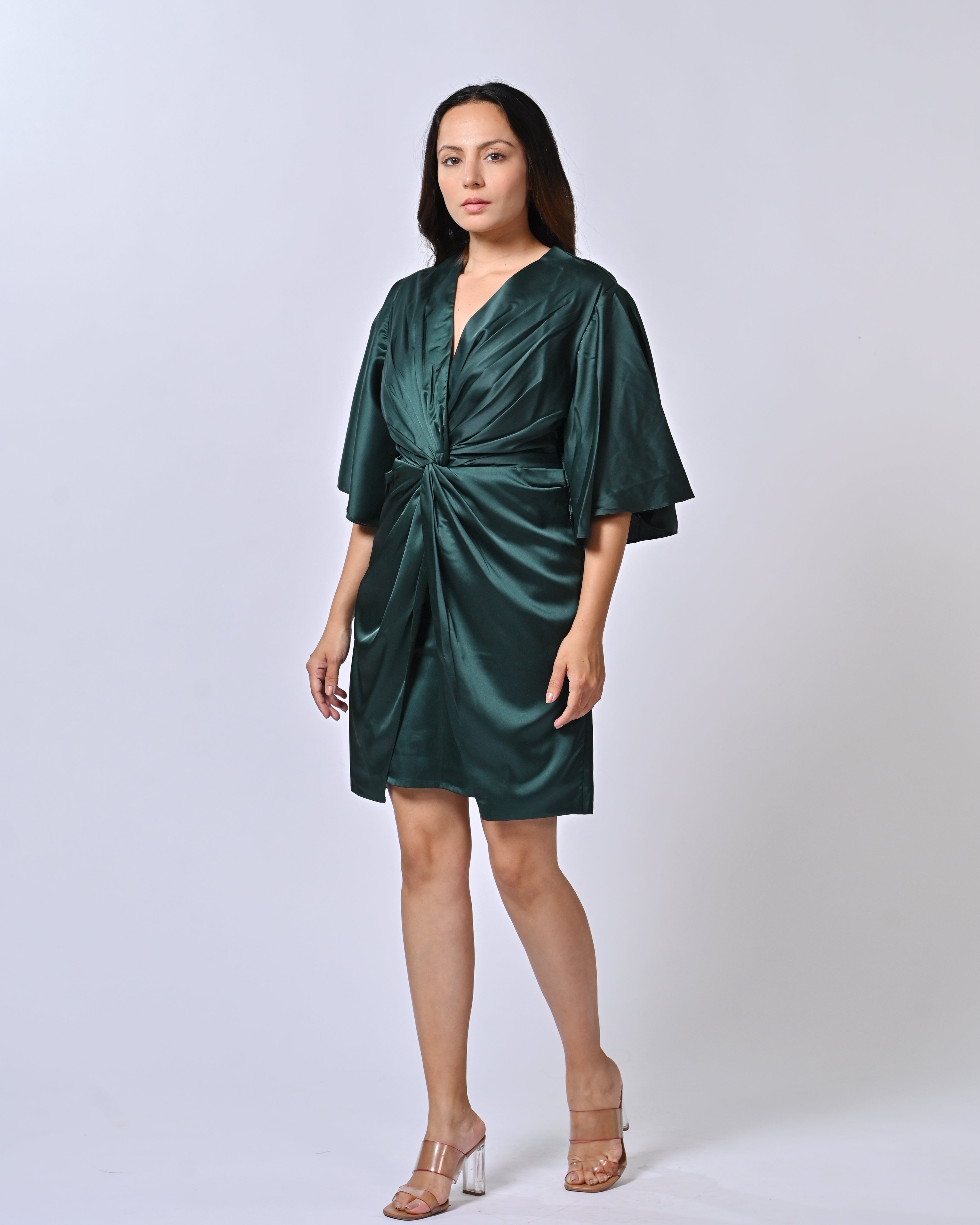 Party Dress, crafted from sumptuous, fluid satin that drapes beautifully. This show-stopping design features a V-neckline, elegant flared sleeves, and a flattering twisted front detail that cinches the waist, creating an hourglass silhouette. The rich emerald hue exudes luxury, perfect for cocktail parties, galas, or romantic evenings. Its mini length adds a playful yet polished edge, ensuring you stand out with effortless grace.