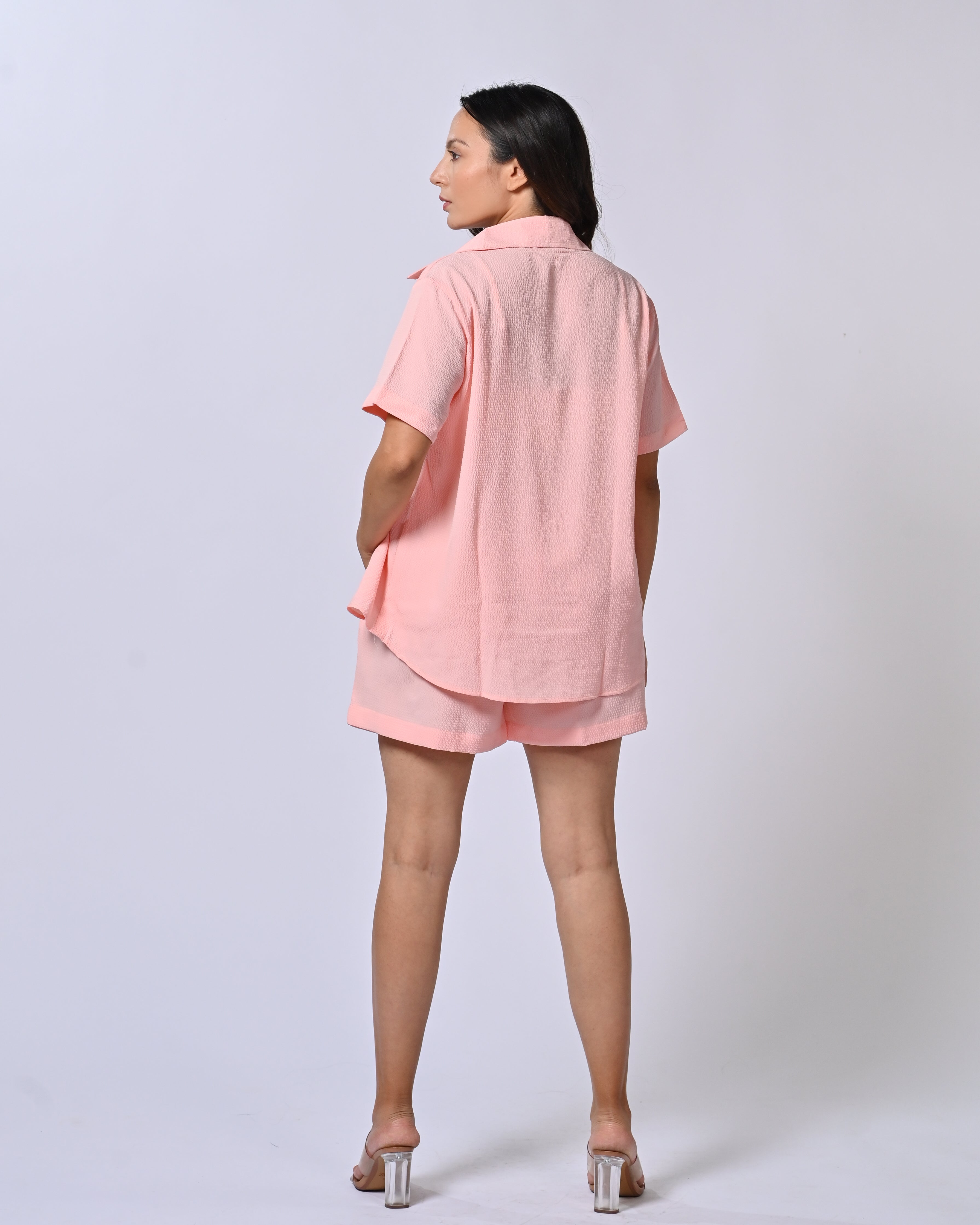 Radiate effortless sophistication with our Peach Elegance Three-Piece Co-ord Set, crafted from luxurious, lightweight polyester for supreme comfort and style. This chic ensemble includes a button-down shirt, a cropped tank top, and relaxed shorts, all in a soft peach hue that exudes warmth and modernity. Perfect for casual outings, beach days, or brunch dates.