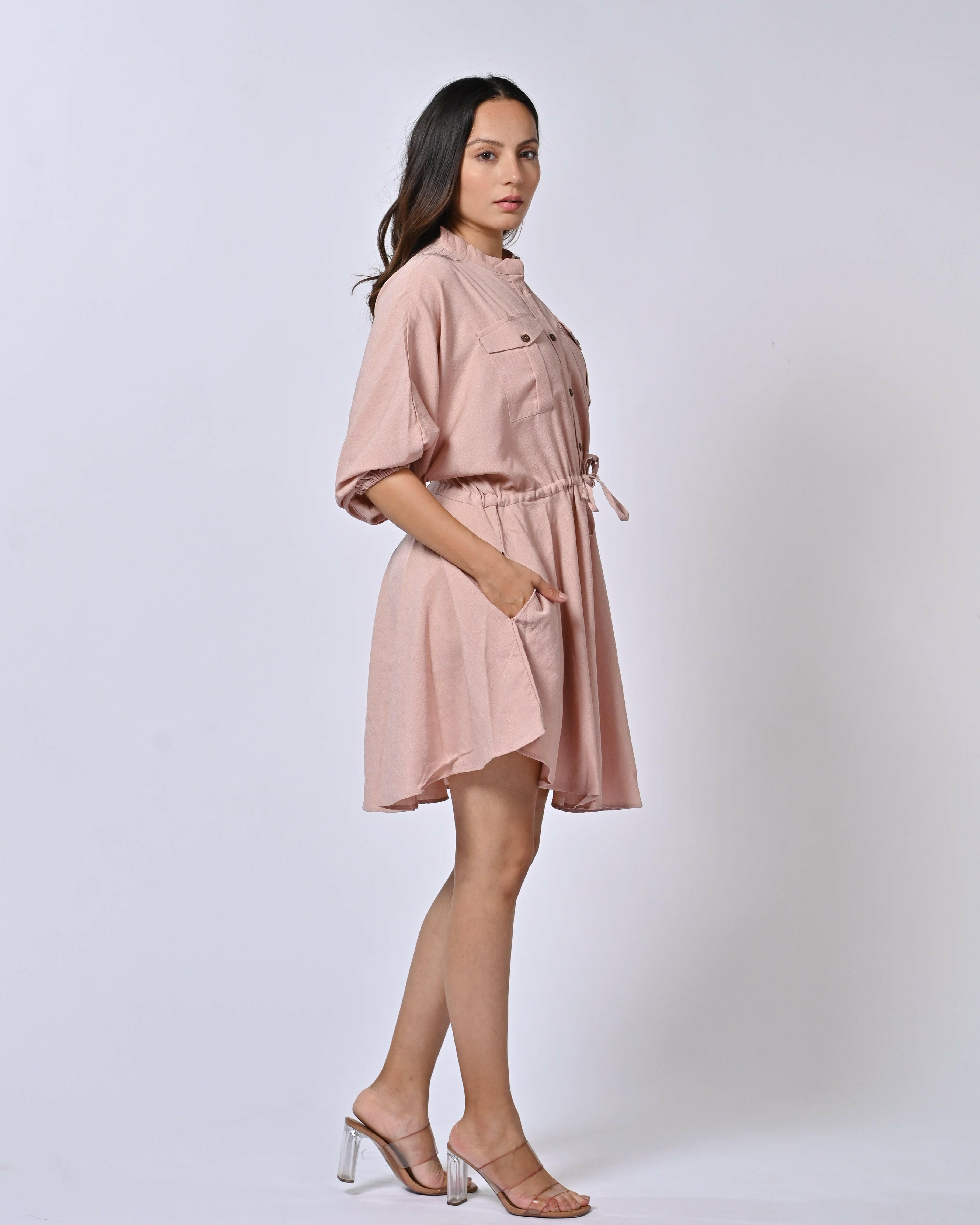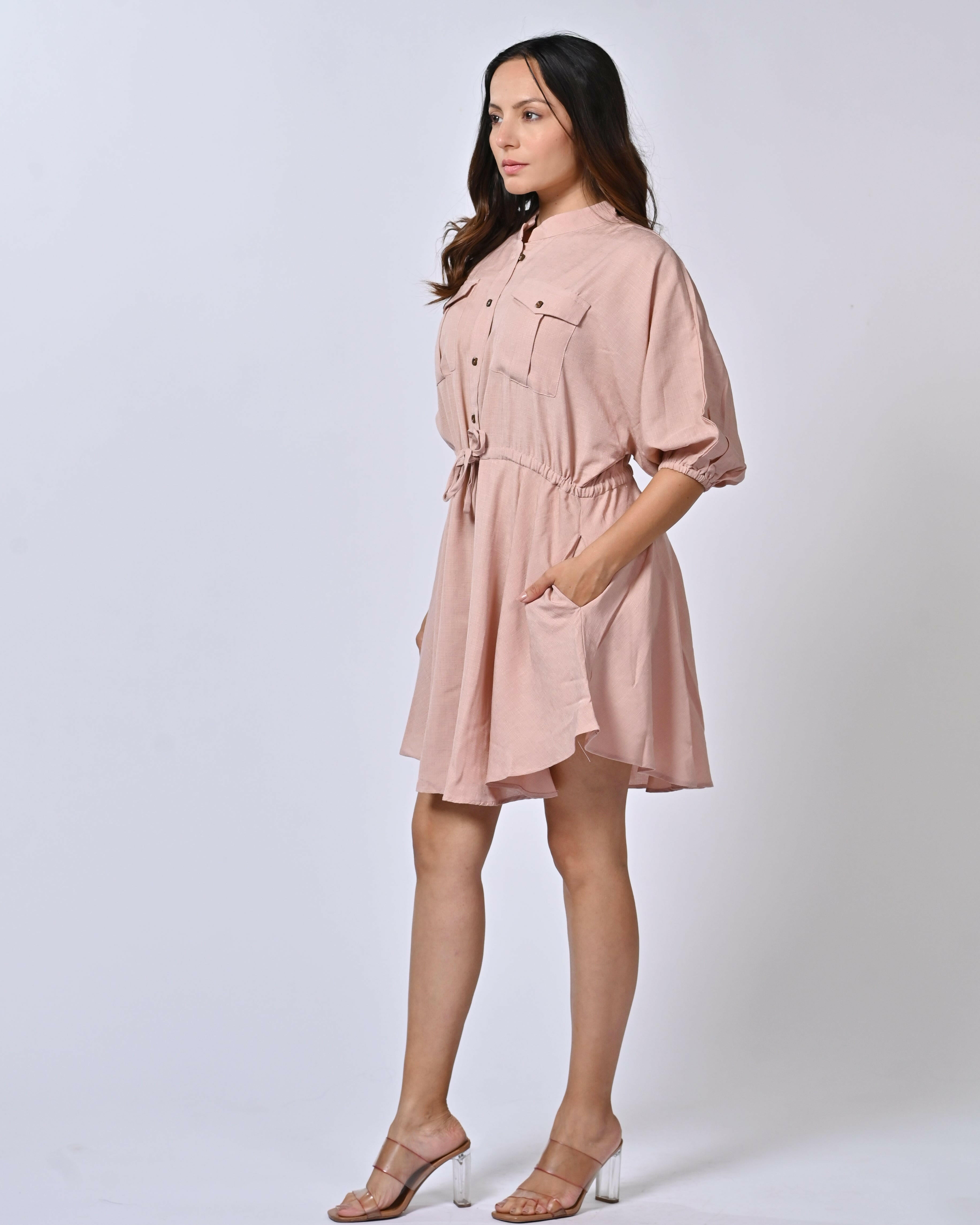 Embrace effortless elegance with our Peach Harmony Mandarin Collar Button-Down Dress, crafted from a soft, breathable cotton blend for all-day comfort. This chic design features a refined mandarin collar, button-down front, and short sleeves, flowing into a flattering A-line silhouette. The delicate peach hue radiates warmth and sophistication, perfect for casual outings, office settings, or brunch dates.