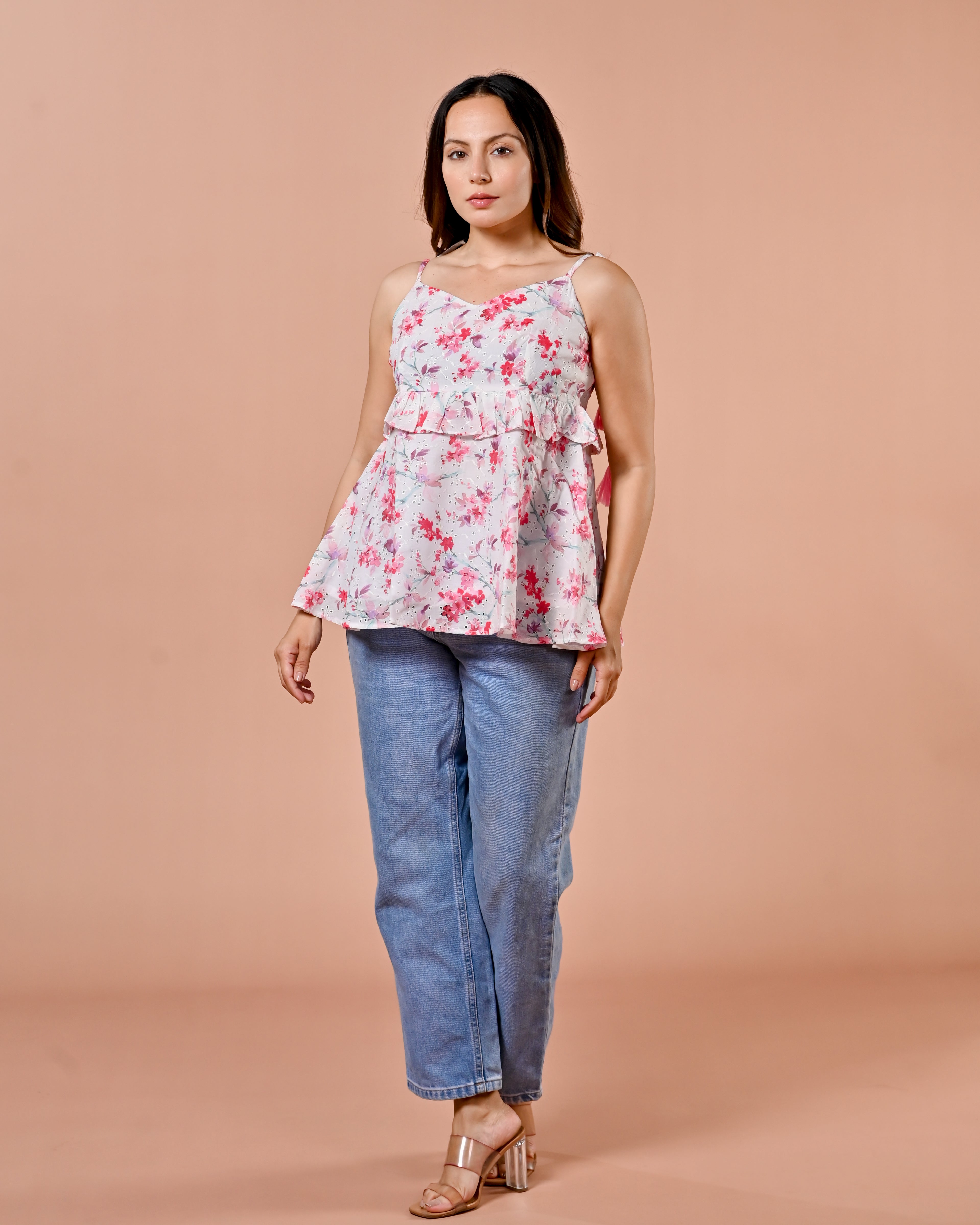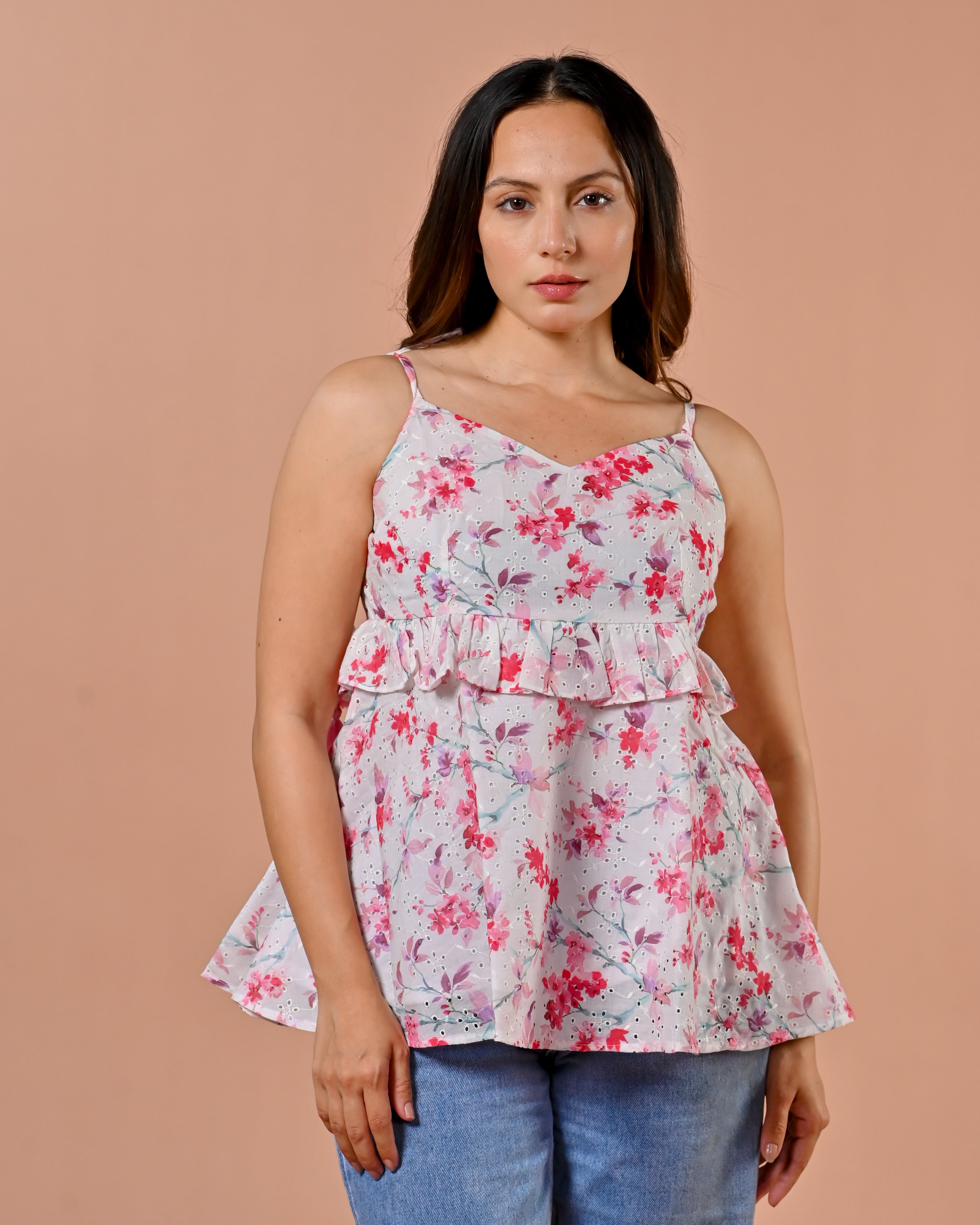 Bloom with effortless charm in our Pretty White & Pink Floral Printed Top, crafted from airy Cotton Schiffli fabric for a lightweight, romantic feel. This enchanting design features a delicate white base adorned with vibrant pink floral prints, spaghetti straps, and a ruffled hem for a feminine touch. Perfect for casual outings, brunches, or garden parties.